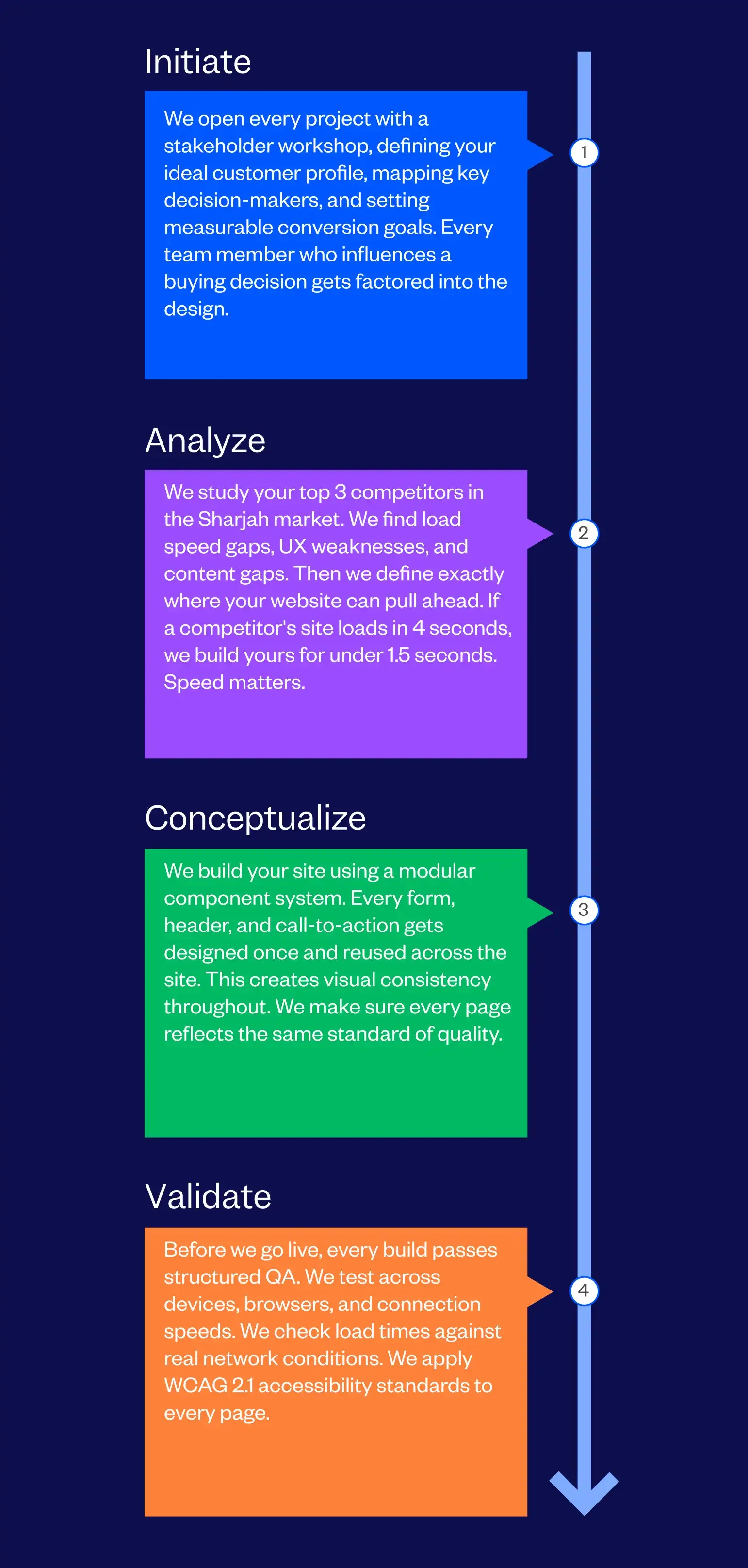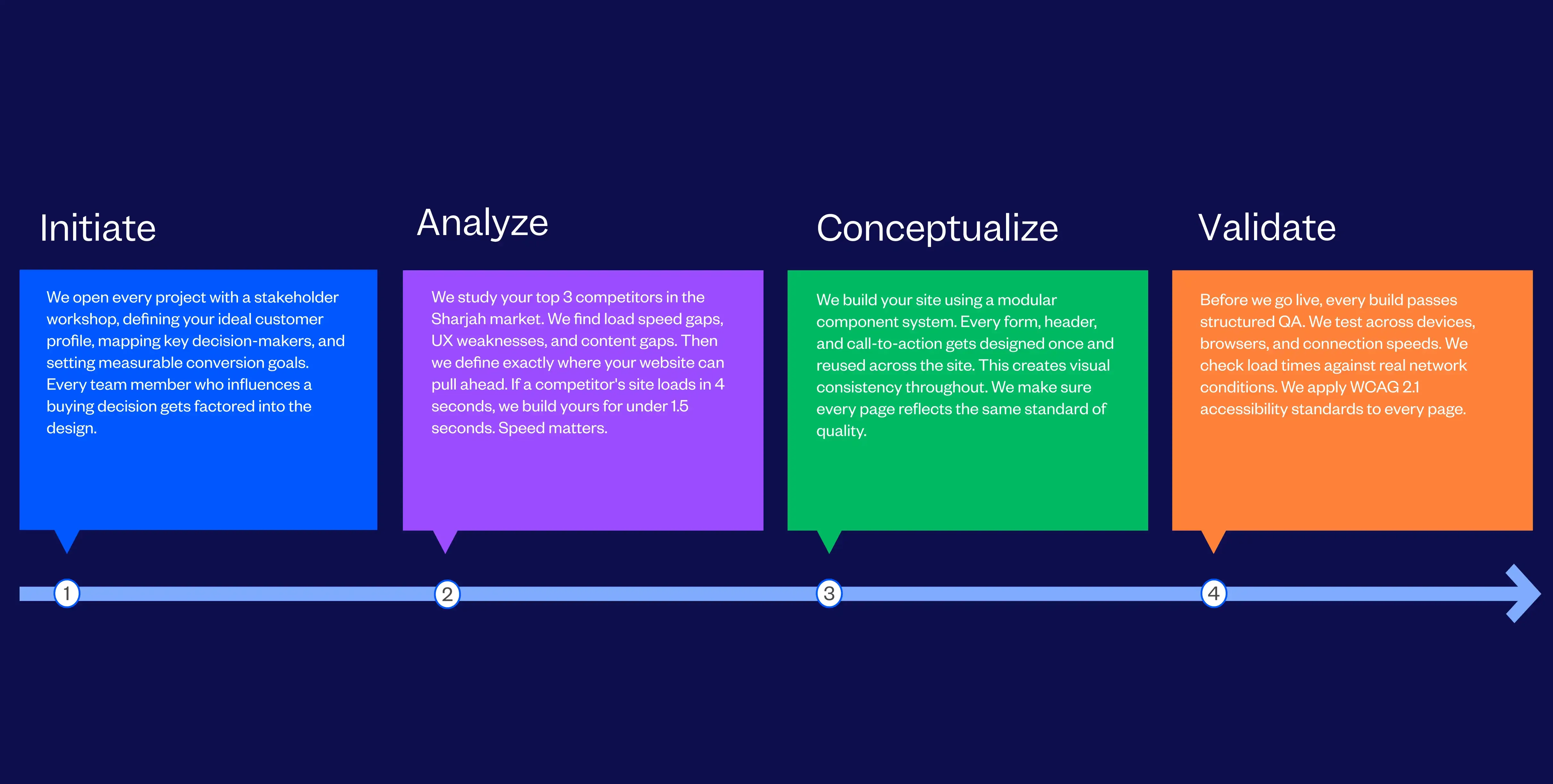 We start by auditing your current site. We study how Sharjah enterprise buyers interact with your pages. We find conversion gaps and map your ideal customer profile. Every recommendation links to a specific pipeline outcome.