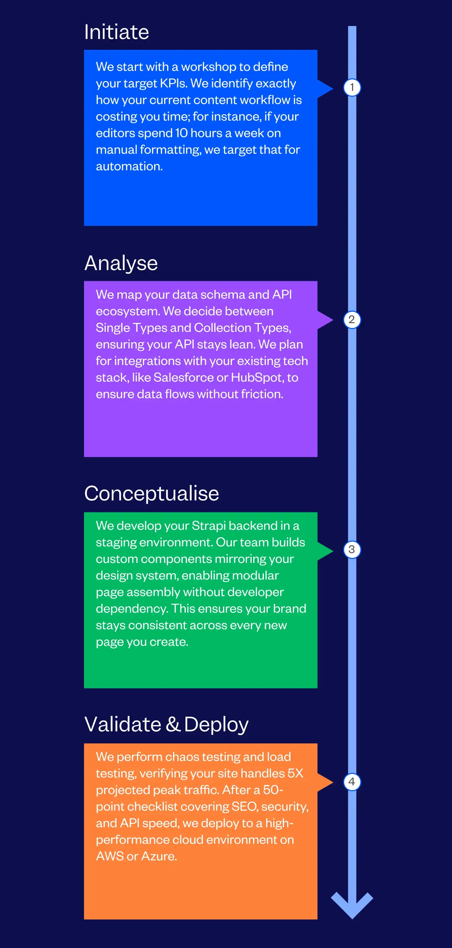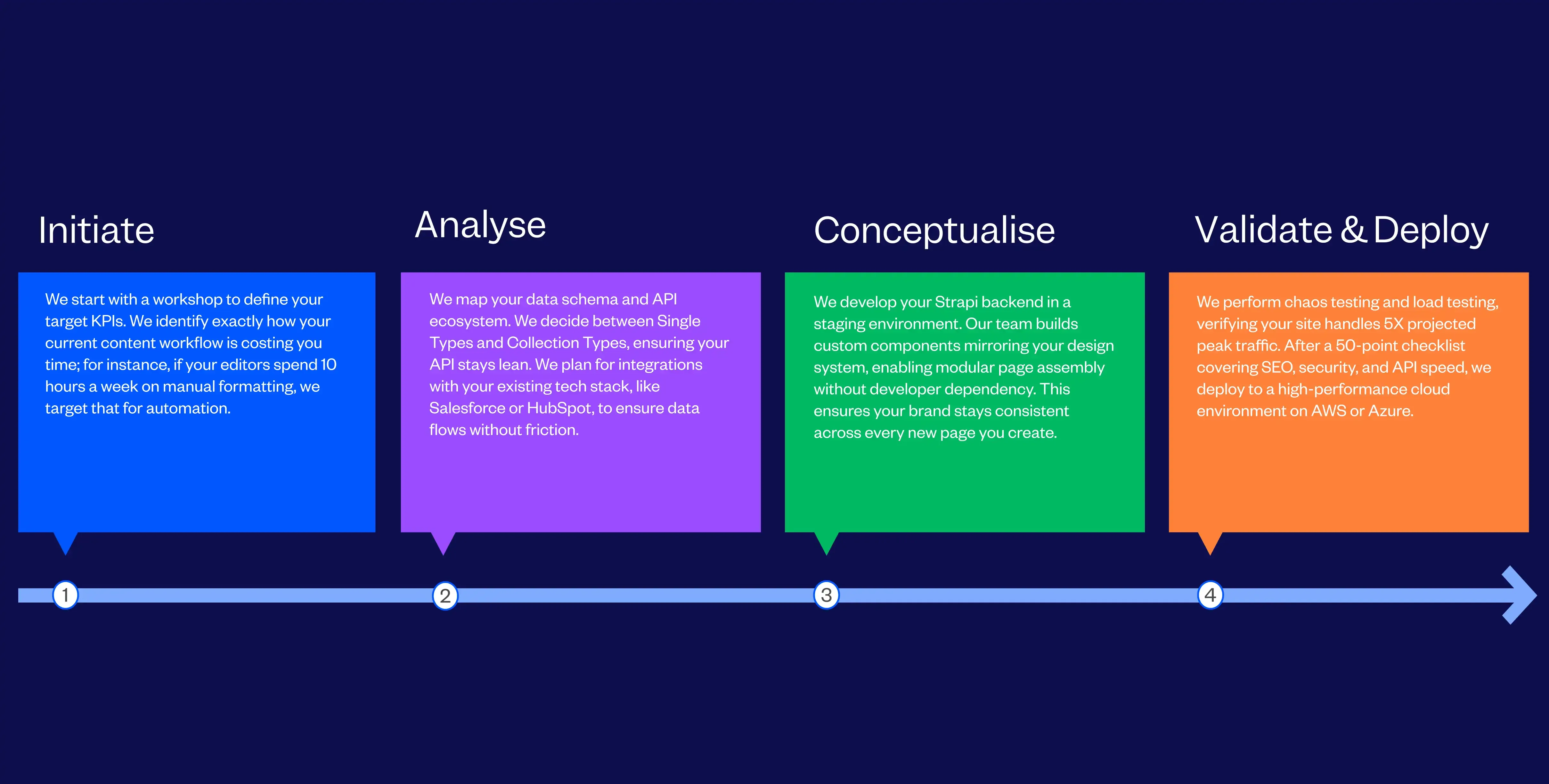 We audit your data architecture, analyze your current API response times (unoptimized legacy systems typically waste 2-3 seconds per request), and map a transition to an efficient Strapi schema.